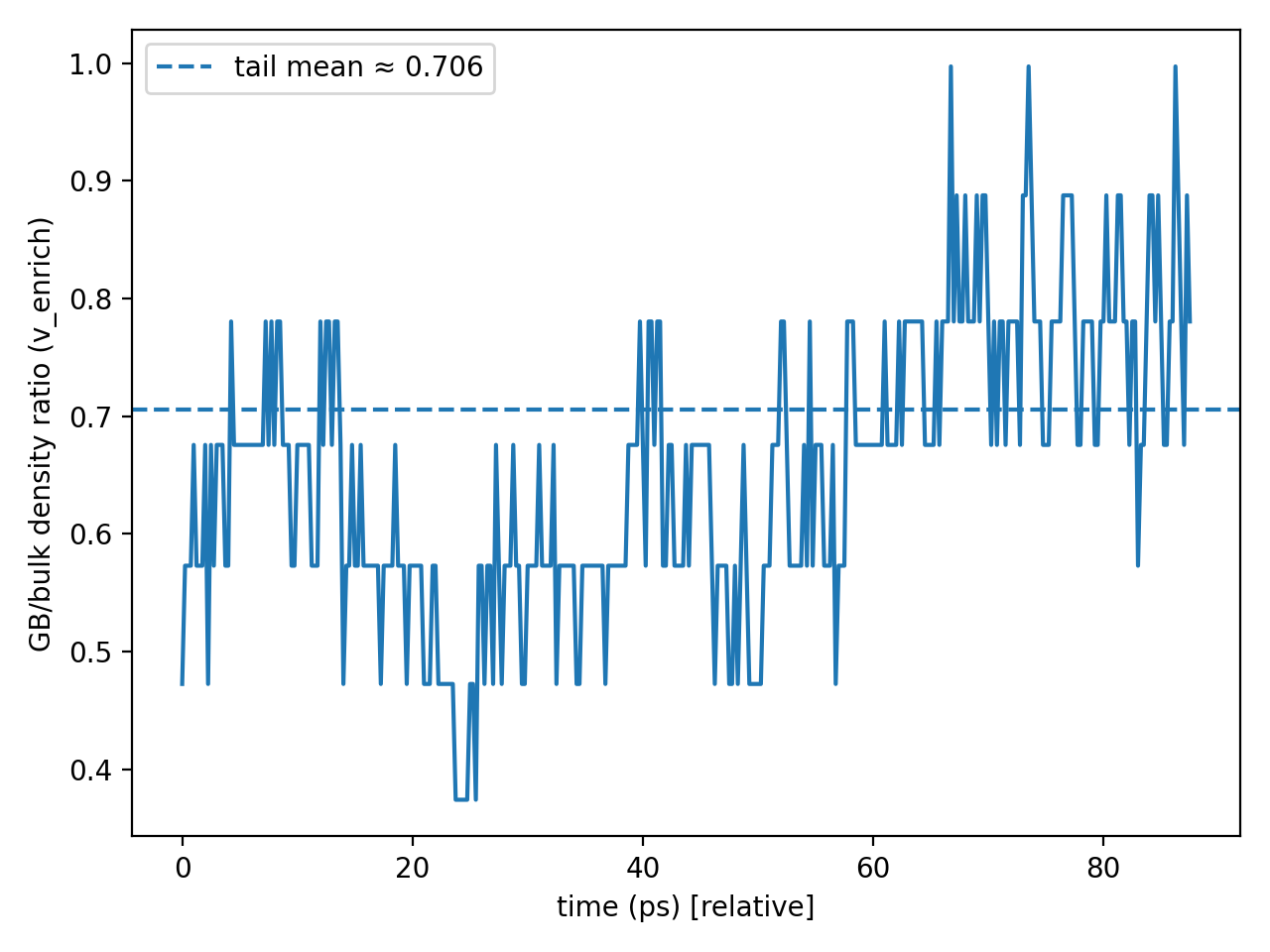 - GB帯(±2Å)平均 ρ_gb ≈ 0.04719 #/ų(≈ 2.18×)
