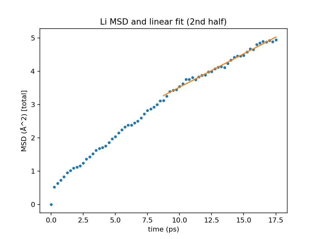 短時間(~17.5 ps)の線形フィットですが、MSDからの拡散係数は